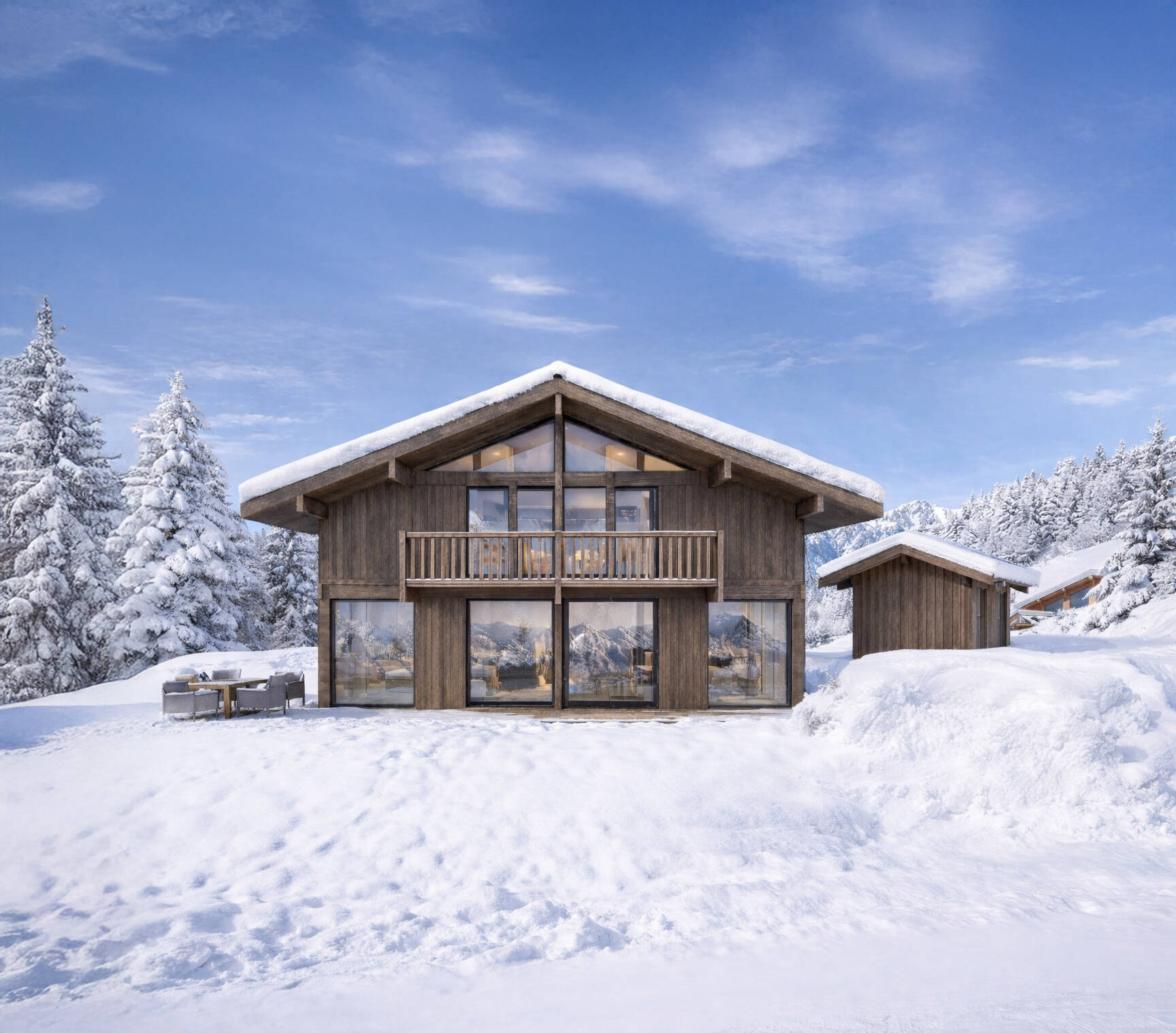 This customizable contemporary wooden chalet of 125 sq m, set on a 1,048 sq m plot, features a spacious living area opening onto the terrace and garden, four bedrooms, and a garage, with beautiful views of the Aravis mountain range and Pointe d’Areu.