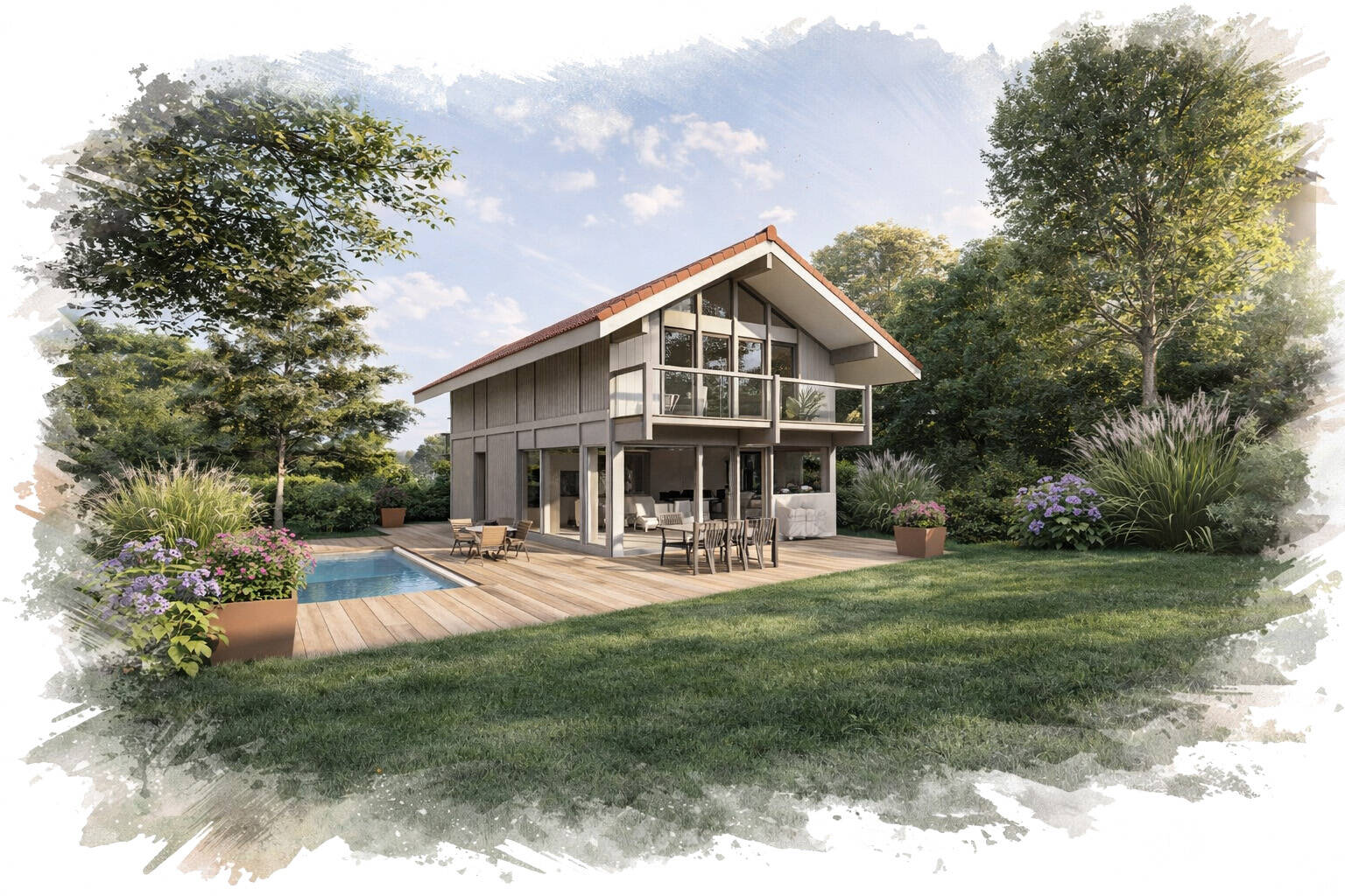 Off-plan sales new home: the indicated price includes the land, the turnkey house construction, outdoor landscaping, studies, and insurances. Notary fees (reduced rate) and kitchen are not included. Non-contractual photos.