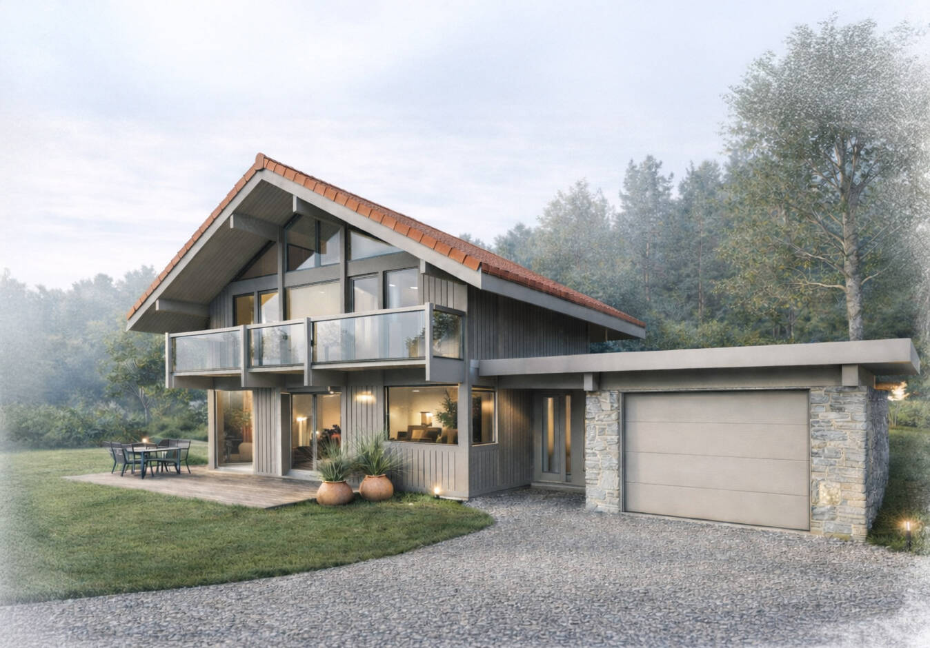 Maison bois contemporaine de 111 m² composée d’une grande pièce à vivre avec cuisine ouverte sur séjour, accès sur la terrasse et son jardin privatif, trois chambres, une buanderie et un garage double sur un terrain ensoleillé de 536 m².